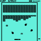 As the game starts, a ball will appear on the paddle. You can move the paddle to aim where the ball will start. If you are using your stylus to move the paddle, momentarily lift the stylus off the screen to launch the ball. You can also press the Page Up key to launch the ball. Note that the ball will launch automatically after 10 seconds. (The Page Up key is in the center of your Palm OS device, between the Address List and To Do list buttons).